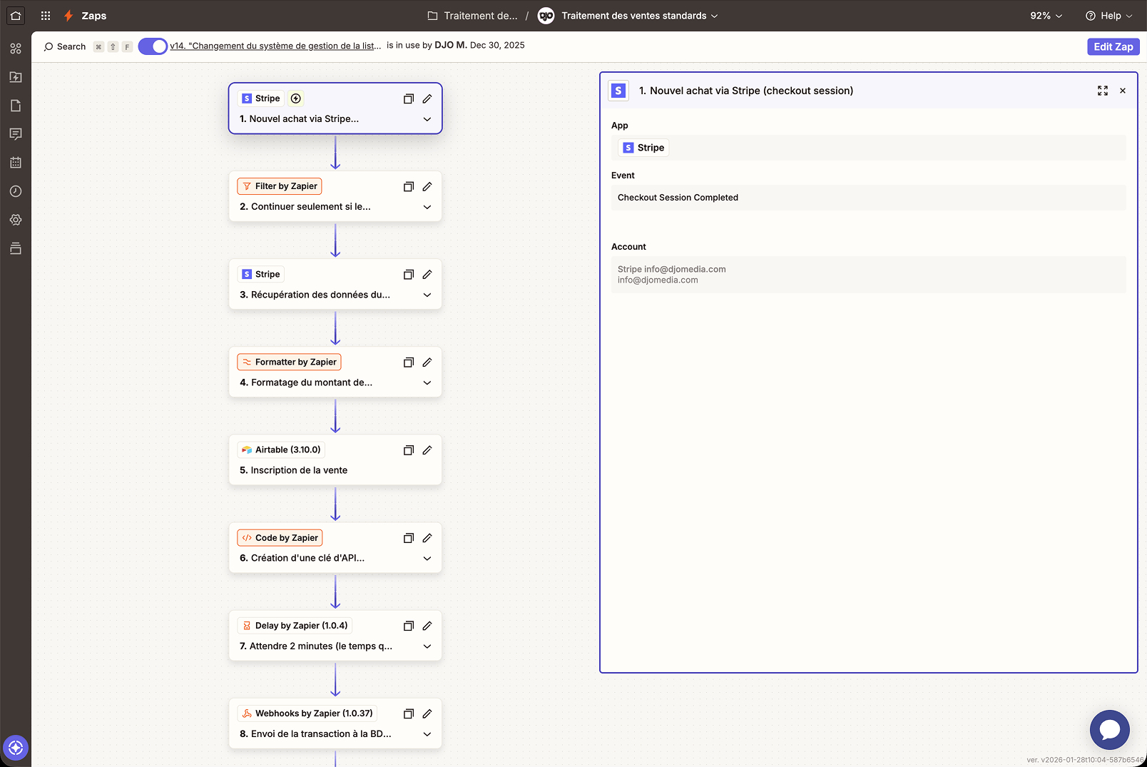 Le programme d'automatisation du traitement des ventes régulières détecte automatiquement qu'une transaction a été complétée du côté de Stripe, et lance instantanément les actions suivantes en séquence.